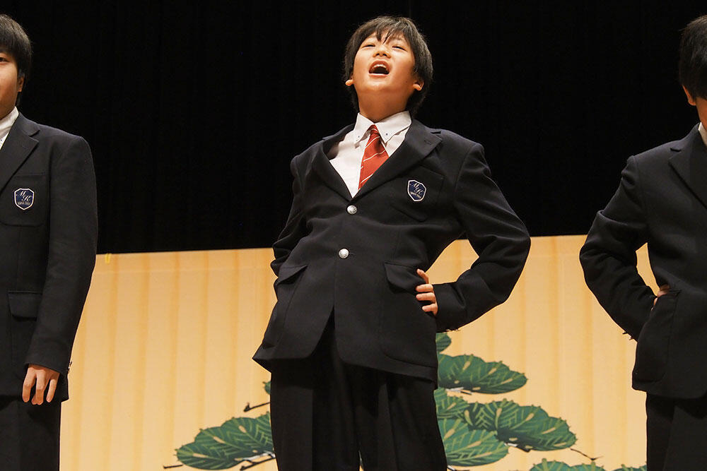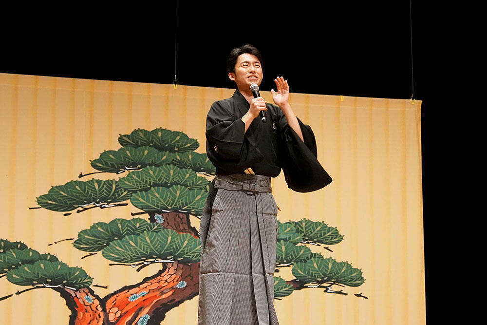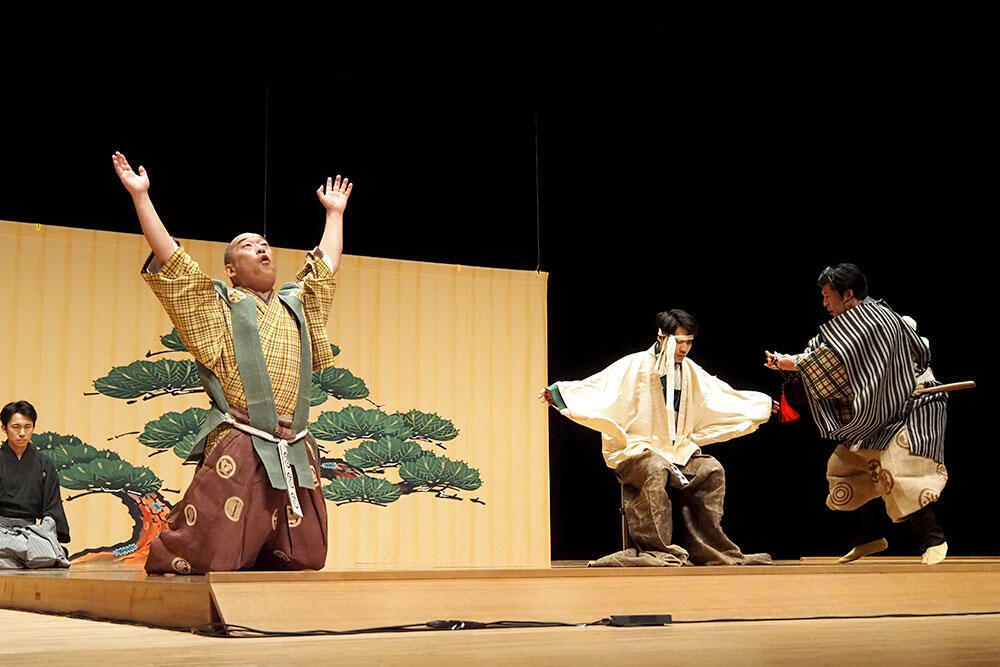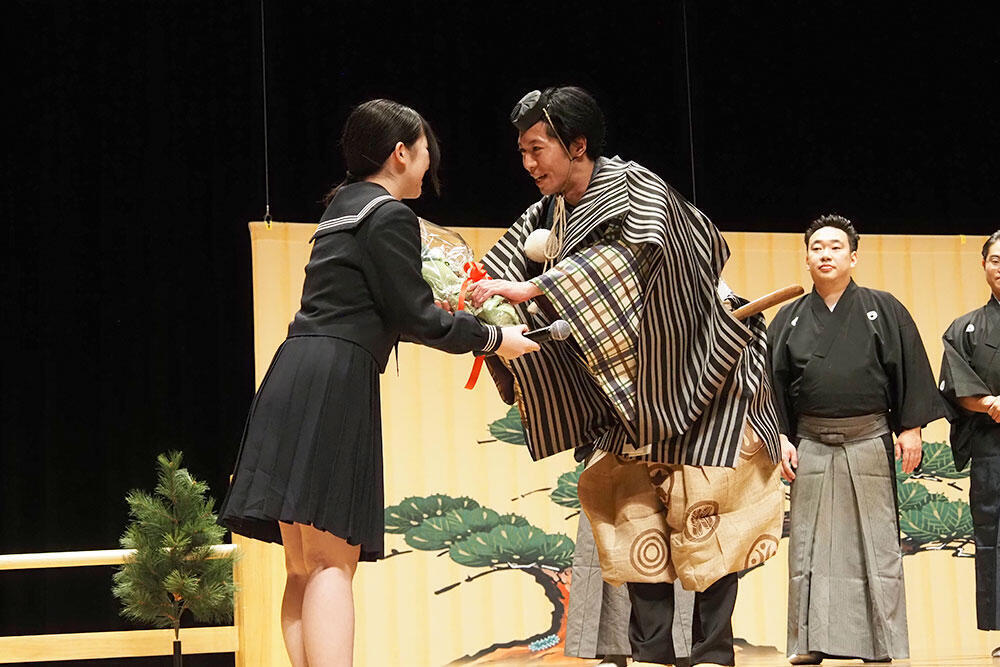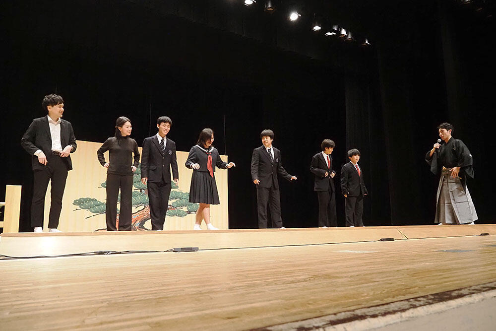そして、生徒・先生も参加しての「狂言体験コーナー」。舞台上の生徒・先生の発声やしぐさに会場は笑いに包まれました。