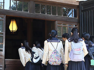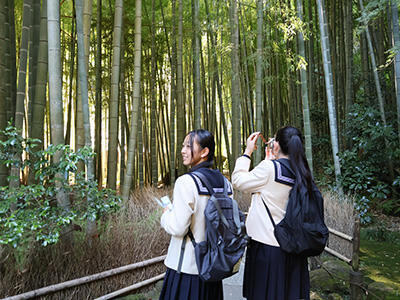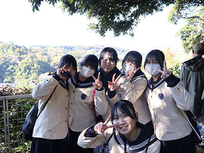 午前中は社会科の先生の解説を聞きながら、クラスごとに円覚寺・建長寺・鶴岡八幡宮をめぐりました。特に円覚寺の境内にある鐘楼からは、鎌倉を囲む山々の向こうにうっすらと富士山を望むことができ、生徒たちからは感嘆の声が漏れていました。また午後には班別行動を行い、生徒たちは事前に計画したプランをもとに、それぞれ関心のある見学地をまわりました。