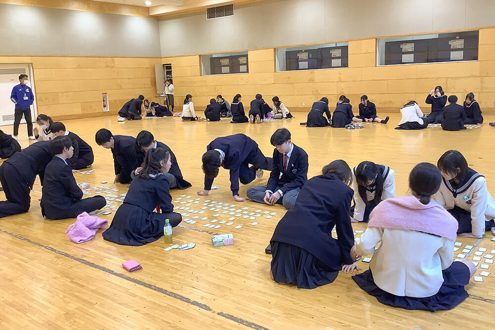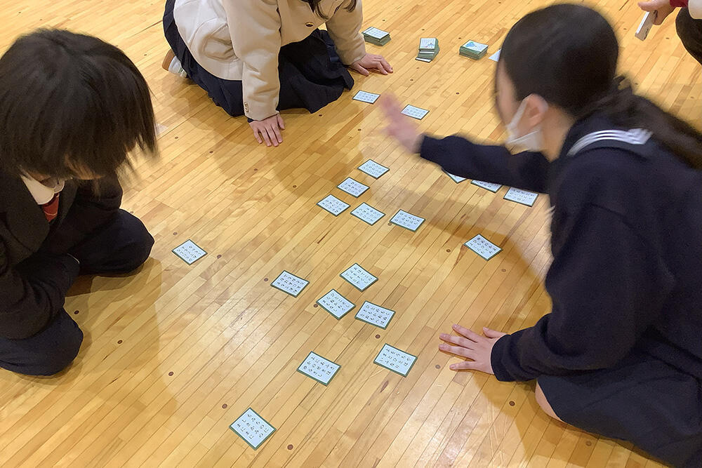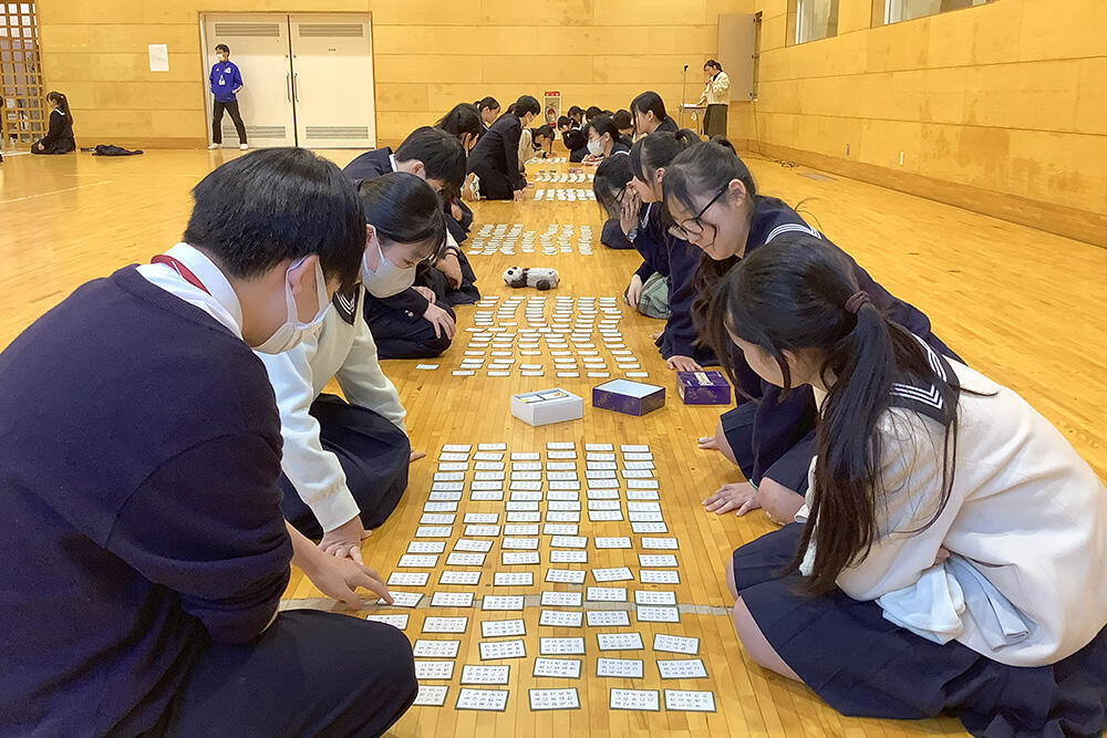 静かな体育館に上の句を詠む先生の声が響く中、集中して札を探し、自分が札を取れば歓声を、友達が素早く札を手にすると賞賛の拍手が起こり、全員で心から楽しみました。中1の時は50分で40枚分しか読み切れず、昨年は80枚まで読んだところで時間が来ていました。今年は50分間で百枚全部を読みきり、みんながたくさんの札をとることができました。和歌についての理解が三年間で深まった成果だと思います。