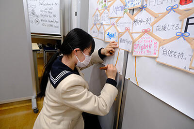 この企画は、毎年中学3年生が絵馬に応援メッセージを書き、Student AmbassadorことSAの生徒たちが集まってすてきなデザインに仕上げています。今年度は、「合格」という願いが叶うように、受験生のみなさんの背中を押せればいいな、という気持ちを込めて作りました。本校へおいでの際は、ぜひご覧ください。