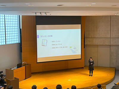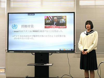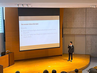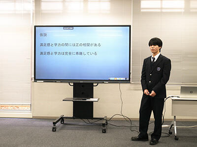 発表当日は原稿を見ずにオーディエンスと対話する形式でプレゼンテーションを行い、保護者や他学年の先生・生徒も聞き入りました。会場には自然と拍手が響き、先輩の発表に目を輝かせる後輩たちの姿が、生徒たちの確かな成長を物語っていました。今年は他学年の先生やクラスメイトからも積極的な質問が寄せられ、発表者・聴衆ともに学び合える有意義な発表会となりました。これが高校3年生にとって最後の発表となりましたが、刺激を受けた後輩たちが来年度さらに磨きをかけた発表を見せてくれることを期待しています。
