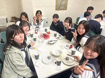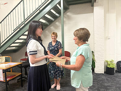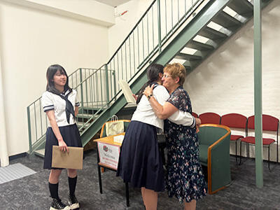 昼食後は語学研修の修了証の授与式を行いました。マーガレットさんやバーバラさんのおかげで語学研修を無事に終えることができました。3名の生徒が代表して英語で感謝の言葉を伝えました。みんなで書いた色紙を渡して、2人に喜んでもらうことができました。お世話になった先生たちとのお別れもとても悲しかったです。
