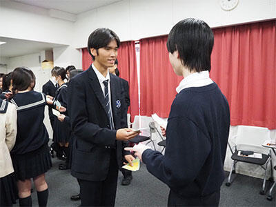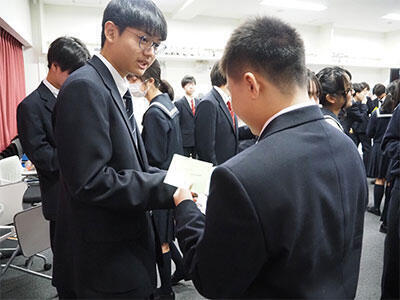 また,ニュージーランドのターム留学から帰国した新高3の帰国式も行いました。代表の生徒一人が英語で即興スピーチを行い,「ニュージーランドにはさまざまなバックグラウンドを持つ人がいますが,みんなとてもフレンドリーです。僕はシャイなのですが,たくさんの人と話すことができました。日本に帰って来ても,これからたくさんの人と話していきたいと思います」と語ってくれました。シャイだけれどいろんな人と話せた,という等身大のスピーチが,緊張気味の新入生たちに「こんな先輩なら話しかけられそう」という安心感と,「自分もいつかこんな経験がしたい」という期待感を与えてくれたことと思います。