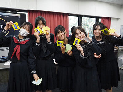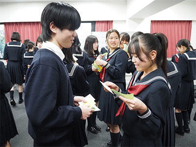 この後,アイスブレイキング活動として,学年を越えて生徒たちが自作のネームカードを交換し自己紹介をしたり,利用交通機関ごとにチームに分かれてメンバー全員の名前を覚えたりと,英語でのゲームを楽しみました。